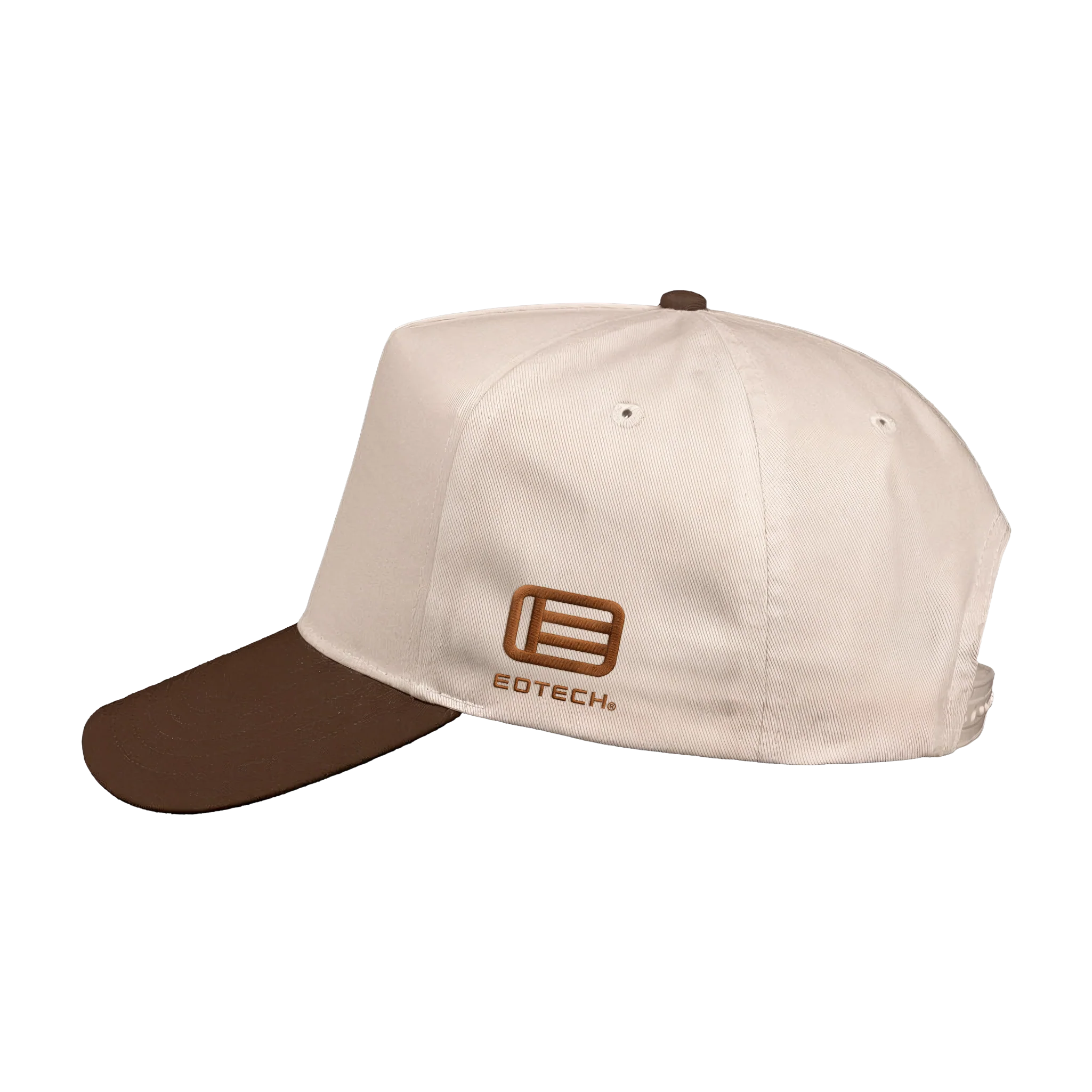This high-crown, structured hat blends warm tan/brown tones with the EOTECH brand.